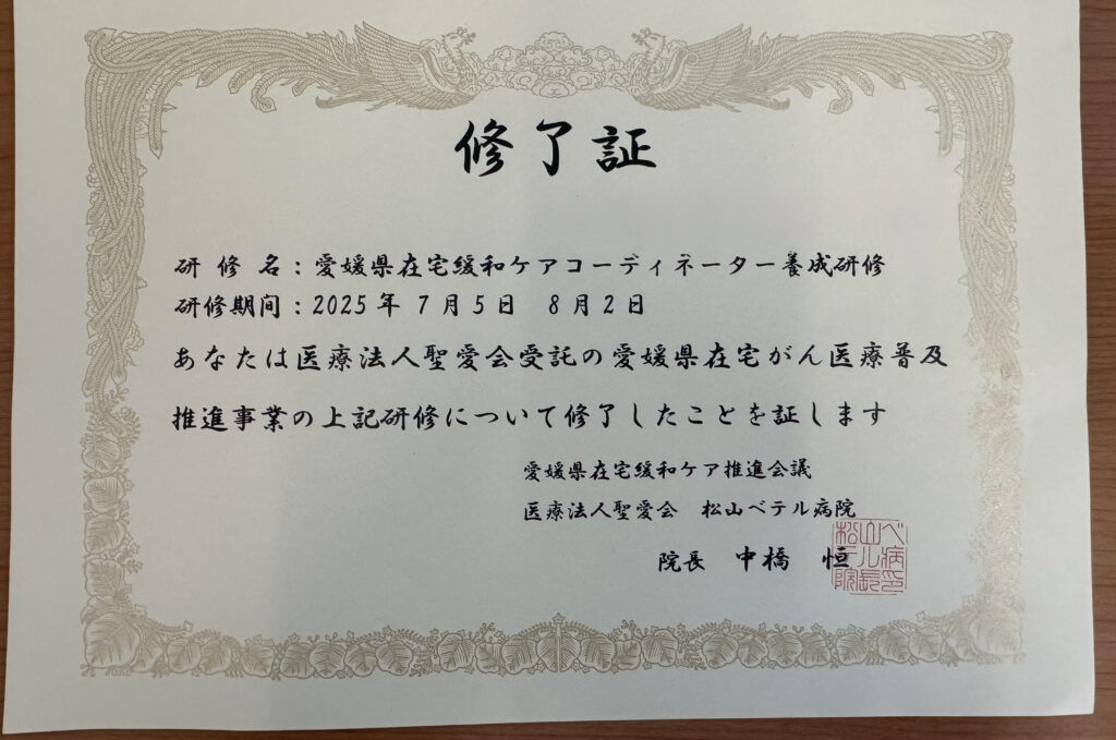 このたび、当ステーションの看護師が在宅緩和コーディネーター養成研修を修了しました。
